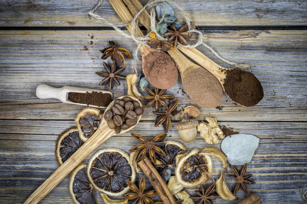 Spitzennoten tanzen, Herznoten erzählen, Basisnoten tragen. Raue Papiere dämpfen, glatte Oberflächen verstärken. Wenn Sie Zitrus mit Wachs auf Holz verbinden, zähmen Sie die Flüchtigkeit. Schreiben Sie uns, welche Texturen Ihren Lieblingsduft am schönsten zur Geltung bringen.
